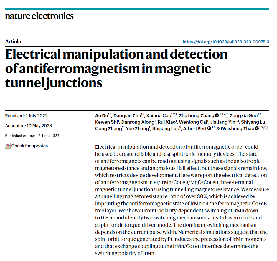 2023年6月12日,beats365亚洲体育投注赵巍胜教授团队于《自然·电子学(Nature Electronics)》在线发表了题为“Electrical manipulation and detection of antiferromagnetism in magnetic tunnel junctions”的研究成果。该工作在磁隧道结中实现了反铁磁的电学调控和检测,揭示了器件的两种翻转机制,即热驱动翻转和自旋轨道矩(SOT)驱动翻转,翻转的模式取决于写入电流脉冲的宽度。通过引入反铁磁材料,该研究构建了SOT型的反铁磁随机存储器(Antiferromagnetic Random Access Memory, ARAM),提供了一种低功耗、高稳定性和高密度的存储方案。我院2021级博士生杜奥、博士后朱道乾、助理教授曹凯华、博士后张志仲和2018级博士生郭宗夏为该论文的共同第一作者,赵巍胜教授是唯一通讯作者,beats365亚洲版官网为第一单位。该工作获得国家重点研发计划重点专项和国家自然科学基金等项目的支持。