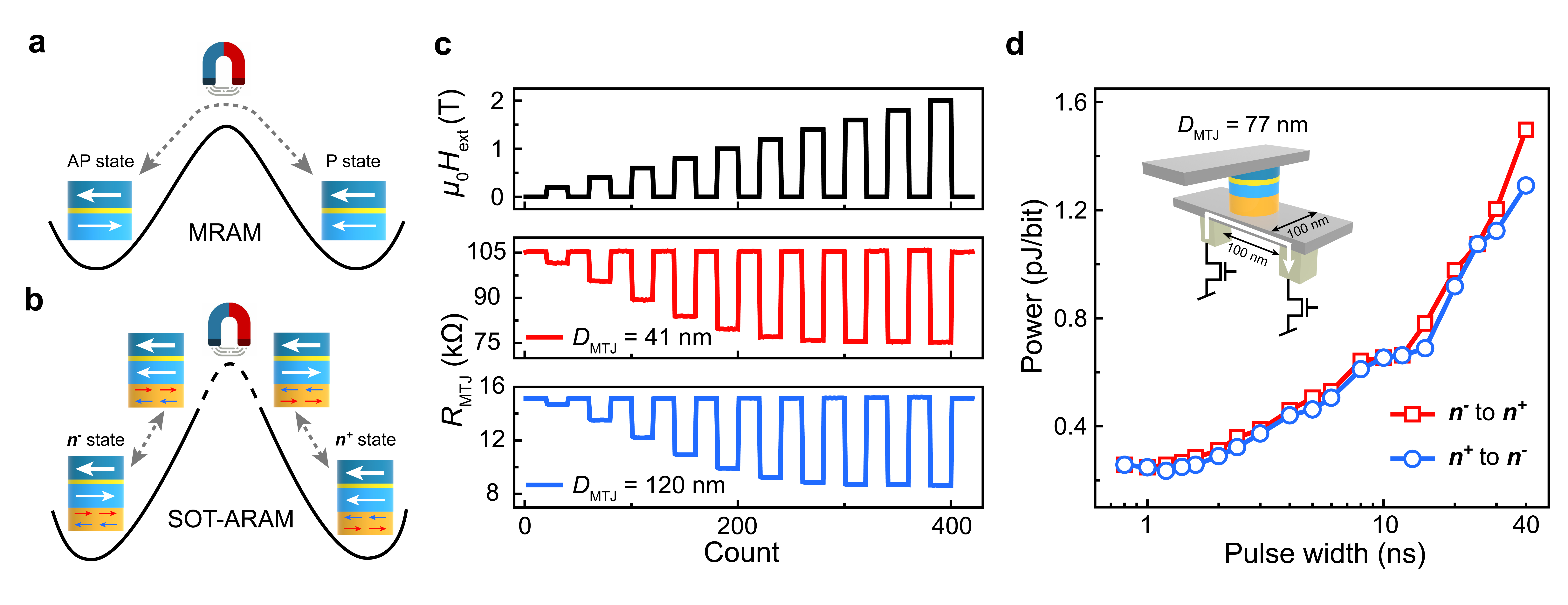 图3:SOT-ARAM器件的结构、性能和功耗。a. MRAM器件的示意图,外磁场会改变AP和P两个存储状态。b. SOT-ARAM器件的示意图,移除外磁场后,器件能恢复到原来的存储状态。c. SOT-ARAM器件在尺寸分别为41纳米和120纳米下的抗磁场性能验证。d. SOT-ARAM器件的功耗验证,1纳秒速度下功耗为0.25 pJ/bit。