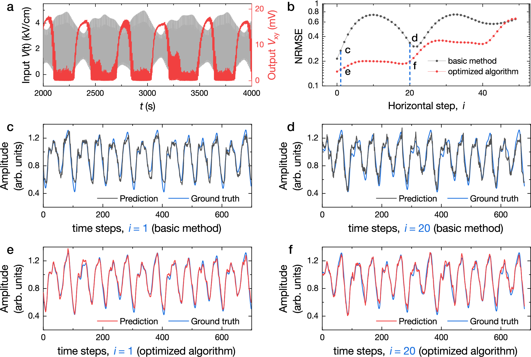研究团队利用电场调控磁斯格明子状态,在PMNT/Pt/Co/Gd多层膜体系中,实现了磁斯格明子增强的物理储备池系统。在验证了系统的非线性后,研究团队首先利用该物理储备池系统完成了简单波形识别任务,识别率达100%(当前)和99.3%(过去)。同时验证了该系统的短时记忆性。另外,研究团队利用该系统对Mackey-Glass混沌时间序列进行预测,成功实现了对未来20步的预测,其预测误差(NRMSE)低于0.2。通过使用纯电学的操纵方式,以铁电衬底的应变为媒介操控信号输入,读取反常霍尔电压作为信号输出,该工作为基于磁斯格明子的自旋电子器件在神经形态计算中的应用提供了低功耗的实现方案。