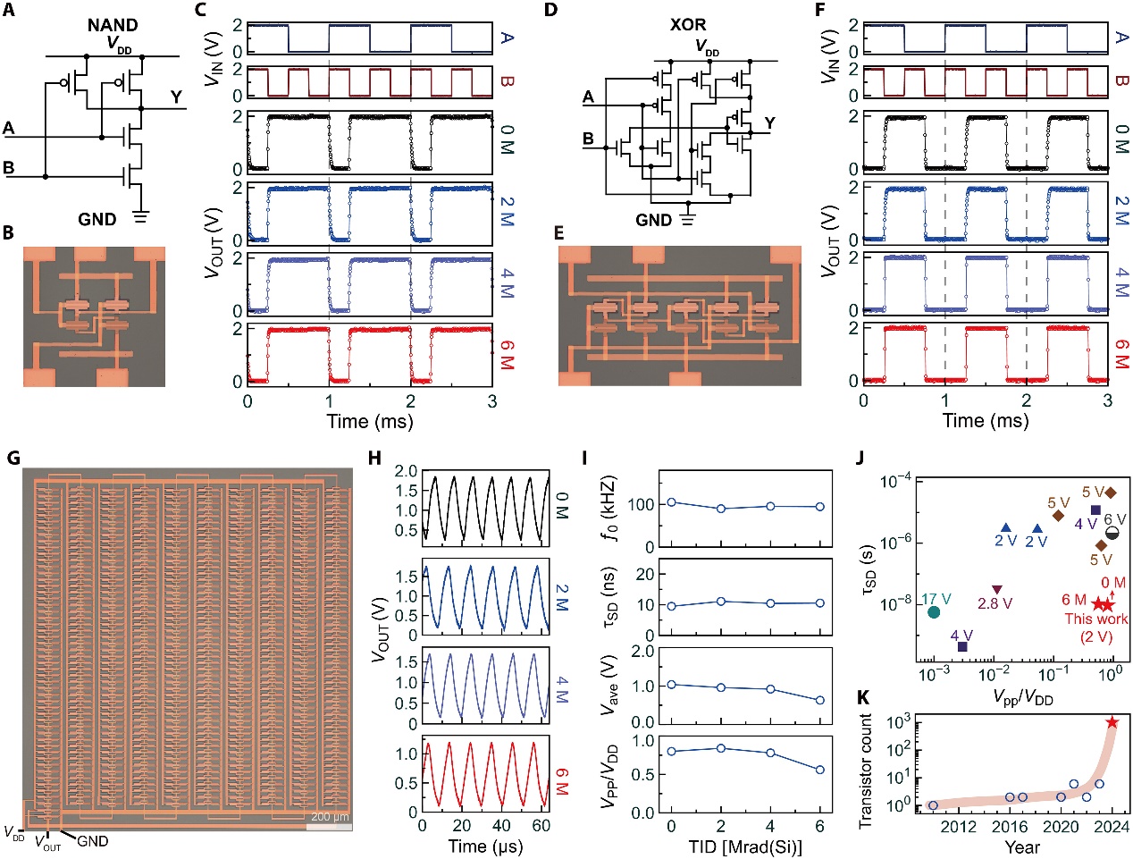 基于此,团队构建了包括反相器、与非门和异或门在内的多种逻辑门以及具有5、11和501个阶段的环形振荡器。实验发现,在高达6 Mrad(Si)的辐射剂量下,所有器件均保持了完整的输出功能,特别是包含1004个碳纳米管场效应晶体管的501阶环形振荡器,其延迟变化很小(10.3 ± 0.8 ns)。