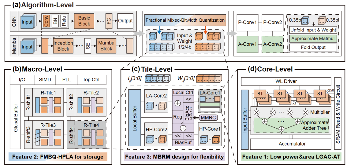 为解决以上问题,本研究提出了PAR-CIM:一种融合精确与近似计算的高能效可重构存算一体宏单元,包含层级/逻辑门级近似加法器树、分数比特混合精度量化、可重构架构三方面创新,从电路、算法和架构层级开展协同优化。在40nm工艺下,PAR-CIM实现了高达3048 TOPS/W(1b/1b)和7.32 TOPS/mm2(1b/1b)的性能,同时量化算法可在精度损失低于0.74%的情况下将ResNet18、V-FuseMBA(新型Mamba网络)压缩86.61%以上,未来在大模型的软硬件协同加速上存在极大的可扩展性。