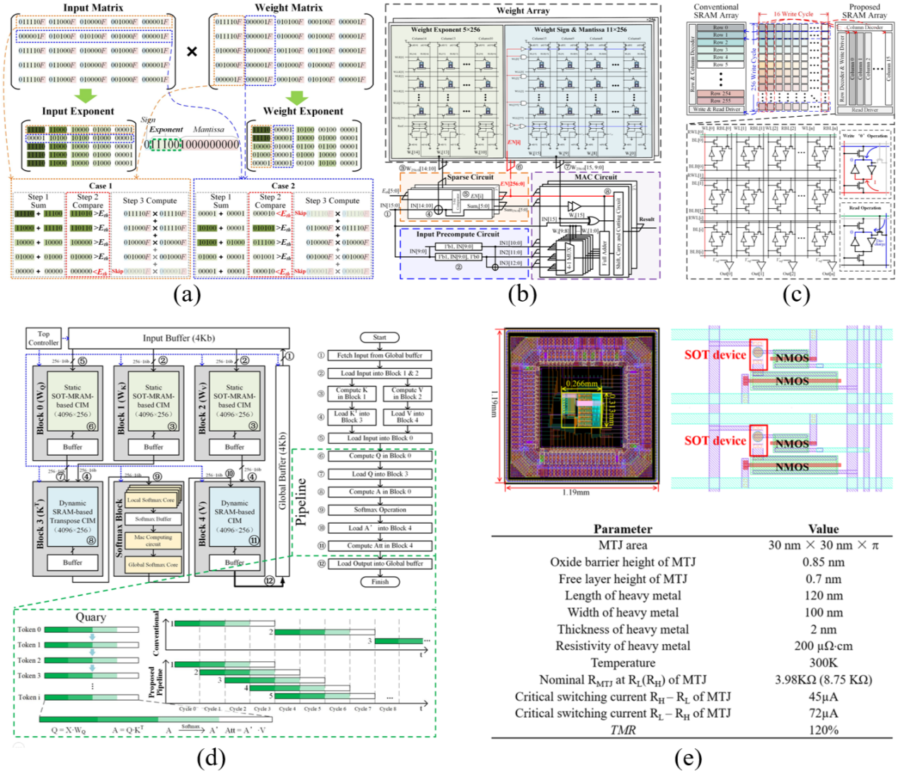 (a)指数位驱动的浮点数动态稀疏机制,(b)混合RAM存算一体架构,(c)SRAM位线转置阵列结构,(d)HRAMTran系统,(e)后仿版图布局
