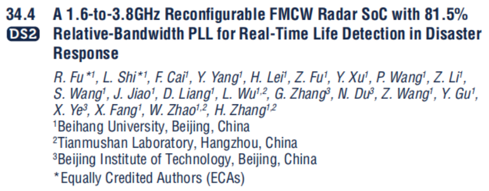 张慧教授、伍连博副教授团队发表的论文名为《A 1.6-to-3.8GHz Reconfigurable FMCW Radar Soc with 81.5% Relative-Bandwidth PLL for Real-Time Life Detection in Disaster Response》,具备1.6GHz至3.8GHz宽频自适应可调节能力,搭载高带宽锁相环,可实现穿透多种障碍物下的多目标运动轨迹跟踪与呼吸体征检测功能。这项技术首次在ISSCC上亮相,未来可在灾后救援、医疗监护、反恐行动等领域发挥重要作用,为复杂环境下的生命探测提供高精度、实时化的芯片级解决方案。论文被安排在Session 34进行报告,并将在Demo Session中进行实物展示,欢迎学界与业界同仁现场交流。