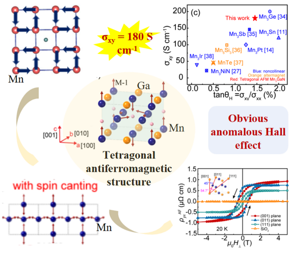 反铁磁材料在自旋电子学领域中展现出鲁棒性和超快动力学等优异的特性,使其在下一代磁存储器的应用中表现出极大的潜在应用价值。众所周知,反铁磁材料几乎不对外表现出净磁化强度,因此理论预测它不会像铁磁材料那样产生反常霍尔效应(AHE),但某些特殊的非共线反铁磁近年来却被报道可以产生显著的AHE。反钙钛矿化合物Mn3GaN存在丰富的非共线与非共面磁结构,因此成为研究反铁磁自旋输运行为的重要体系之一。Mn3GaN除了拥有被广泛关注的Γ5g三角反铁磁相外,在压力或引入空位的情况下,该体系在低温区还存在一种称为M-1的四方反铁磁结构。至今,AHE在反铁磁体系中主要存在于非共线三角反铁磁和交变磁中,该M-1四方反铁磁结构是否也存在反常霍尔效应,未曾见过报道。探索不同反铁磁结构产生AHE的可能性与机制不仅为自旋电子学的发展提供新的理论指导,而且为新型反铁磁磁存储器的研发提供新的材料基础。
