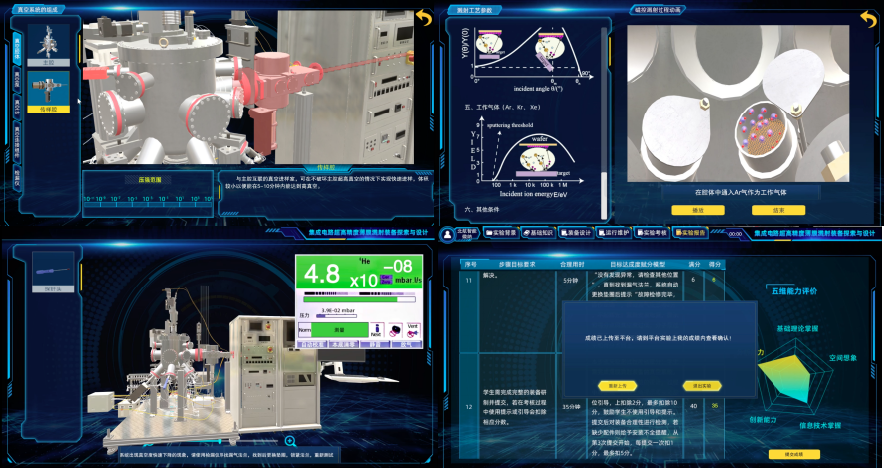 《集成电路超高精度薄膜溅射装备探索与设计虚拟仿真实验》由beats365亚洲版官网副校长赵巍胜教授领衔主讲,张慧副教授、柳洋讲师、王新河副教授和郑翔宇助理教授作为主要成员参与建设。课程面向集成电路关键装备国产化,对超高精度薄膜溅射装备研制全过程进行仿真再现,根据不同真空度要求设计组装真空系统,重点掌握溅射镀膜原理,深入探究超高精度薄膜沉积工艺参数,通过装备构造认知、装备搭建、运行和维护全流程的交互操作,完成高精度薄膜溅射系统的自主探索与设计,培养学生运用所学专业知识分析解决复杂工程技术问题的实践能力和创新思维。