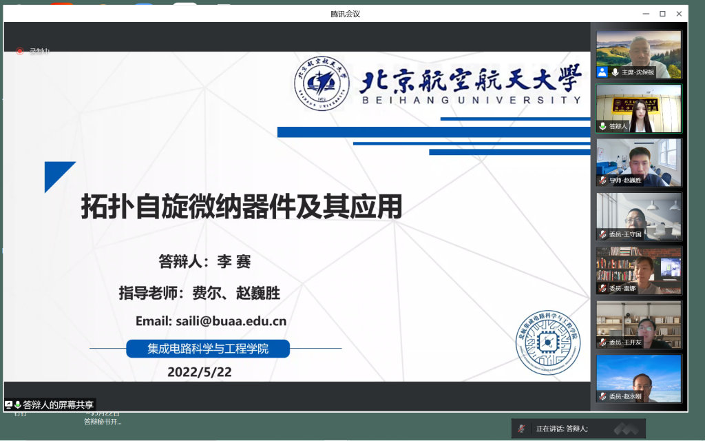 2022年5月22日下午,学院赵巍胜教授团队两位博士研究生李赛、朱道乾(均为北航博士研究生十佳获得者)进行了线上博士学位论文答辩,并顺利通过答辩,成为beats365亚洲体育投注在疫情防控期间首批通过线上完成学位论文答辩的博士生。