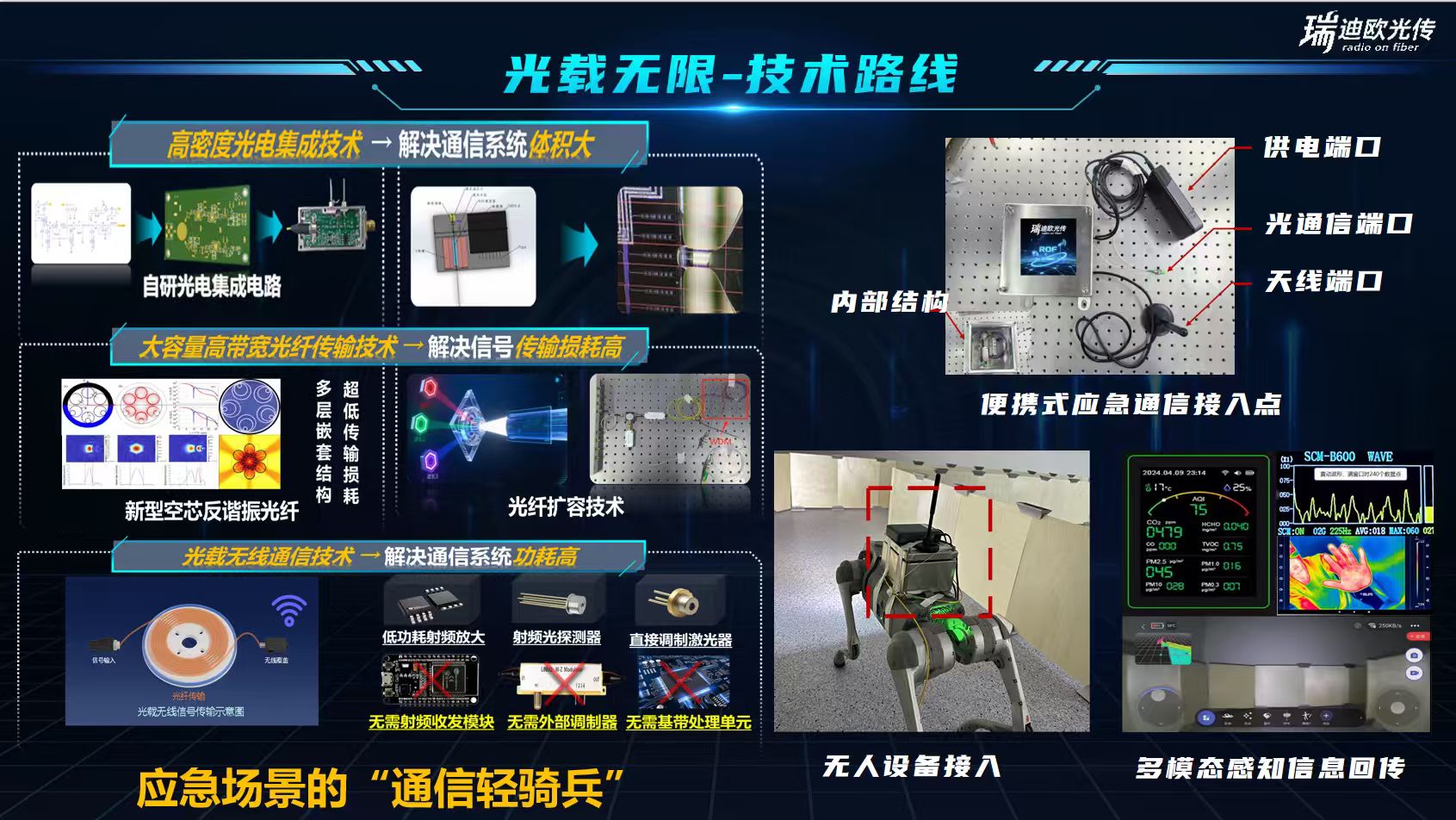 光载无限系统创新性地采用波分复用技术实现收发一体的单纤双工通信;采用环形器实现收发信号路径隔离,隔离度≥15 dB,规避同频自干扰,单纤承载双通道,带宽利用率翻倍同时系统采用低损耗的光纤作为传播介质,功耗仅为0.94 W、传输损耗仅为1 dB,并且实现了收发一体设计,设备尺寸仅为112.5×78×15 mm、重量为150 g,便于随身携带且可轻松搭载于机器狗、无人机等智能移动平台,实现“人机协同”的机动应急通信能力。