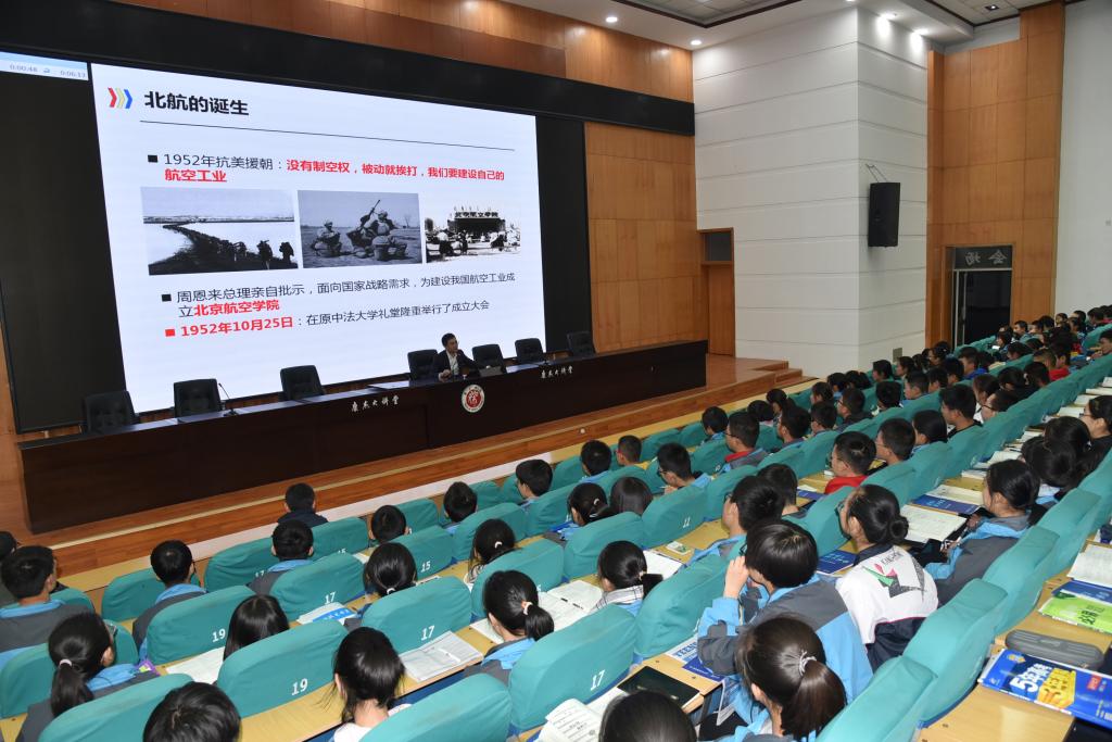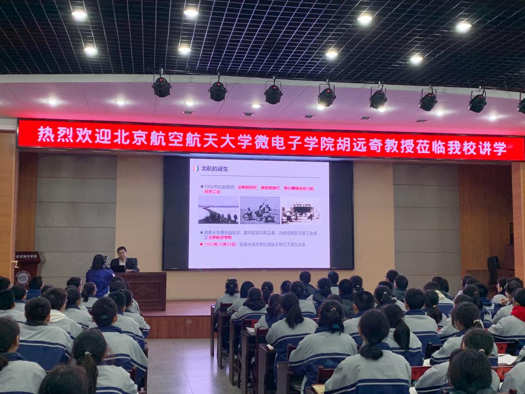 胡远奇教授为同学们带来了主题为“报‘校’祖国 专‘芯’学习”的精彩报告,向同学们介绍了北航的历史、风貌及招生政策,同时生动地讲解了微电子科学在现代信息社会中的重要性,鼓励同学们在高中学习中打下坚实基础,争取加入北航,成就自我,报效祖国。