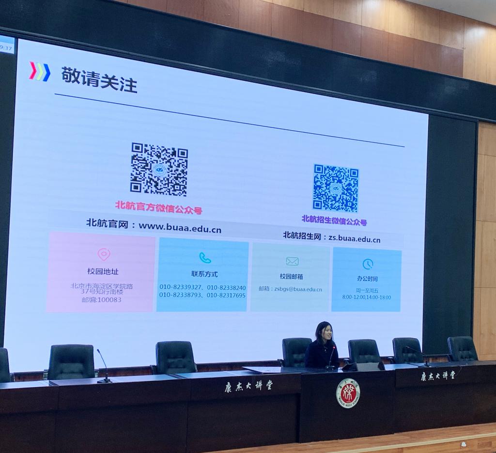 康杰中学校友、北航微电子学院博士生闫韶华介绍了自己的成长经历和科研方向,鼓励师弟师妹们努力学习,考入北航,为国铸“芯”。