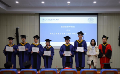 党委副书记马田宣读2024届优秀毕业生获奖名单,高静书记为北京市优秀毕业生颁发获奖证书,副院长胡远奇为校级一等优秀毕业生颁发获奖证书,集成电路工艺与装备系主任李奕晗、数理基础教研室主任雷娜为校级二等优秀毕业生颁发获奖证书。