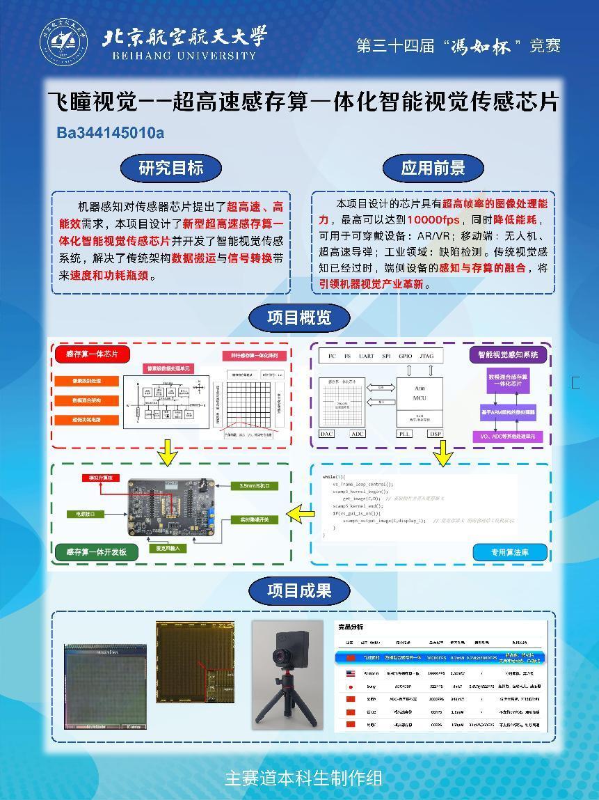 其中,我院“飞瞳视觉——超高速感存算一体化智能视觉传感芯片”团队,取得了本次冯如杯主赛道本科生制作组一等奖最高分的成绩。