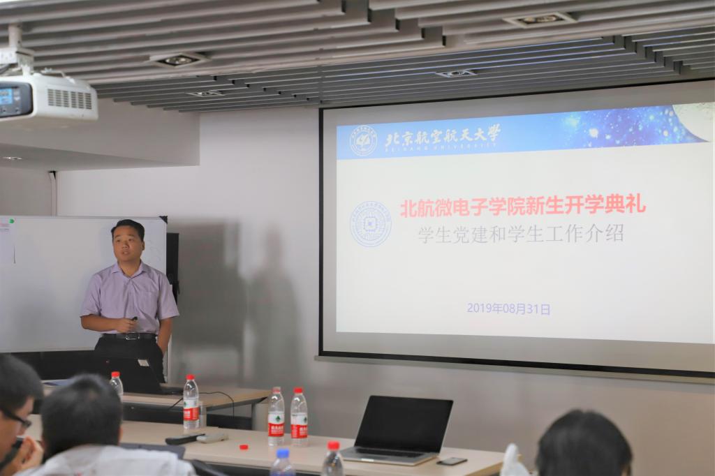 在观看了微电子学院宣传视频后,院长赵巍胜教授进行致辞,赵院长对新同学表示欢迎,他从微电子产业发展现状、学院建设背景、学生培养体系及培养目标等方面对学院进行了介绍,并鼓励学生志存高远,将自己的汗水融入时代变革的大潮;树立理想,把自己的努力投入民族复兴的重任。