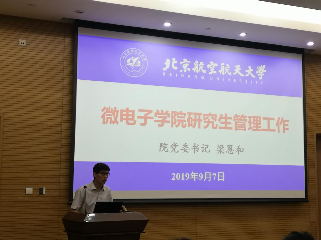 随后,学院书记梁恩和老师向同学们介绍了党建工作、奖励体系以及违纪处分等内容和要求。研究生教学院长助理聂天晓教授和主管实验室院长助理林晓阳老师就同学们关心的培养方案、选课要求、国际交流合作、实验室日常管理制度及安全管理规定等内容进行了讲解。北航青岛和合肥微电子分院负责人温良恭老师和张悦老师分别介绍了分院具体情况。学院优秀研究生代表周家琦同学也进行了致辞,代表学院全体学生对新同学的到来表示欢迎,祝愿他们能在良好的氛围中砥砺前行,不负光阴,度过精彩的科研学习生活。