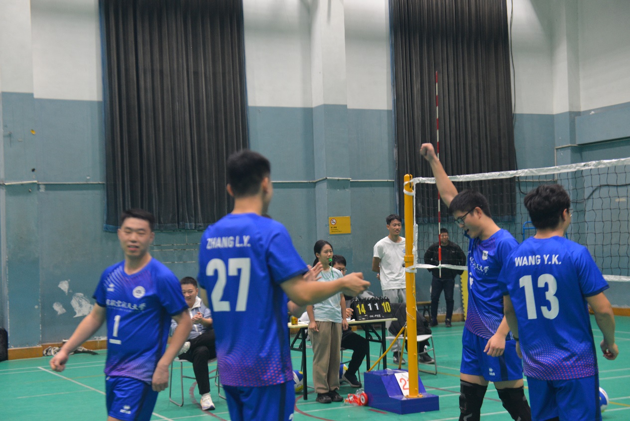 决赛中遭遇实力强劲的北航校友队,校友队由多名毕业于北航的专业运动员组成,无论是身体素质还是技巧战术都是顶尖的水平。第一局比赛一度以20比16的比分率先拿到赛点,但北航队伍也没有轻易放弃,顽强拼搏下连续挽救4个赛点,最终以22比20的比分完成惊天逆转。第二局校友队展现出强大的实力,强势扳回一城,将悬念拖入决胜局。决胜局中双方你来我往难解难分,最终由北航一队两个强势的拦网结束了比赛,获得了这来之不易的冠军。