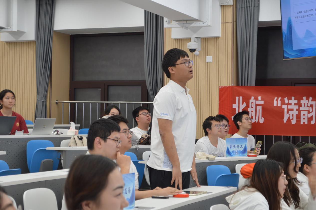 5月16日19:00,大会决赛在学院路校区主201举行。决赛第一轮“博闻多识”通过必答题考验参赛队员的诗词积累与相关文化知识,“诗话芯语”队以全场第二名的优势晋级,并在第二轮“学富五车”的抢答比拼中继续名列前茅,挺进四强行列。