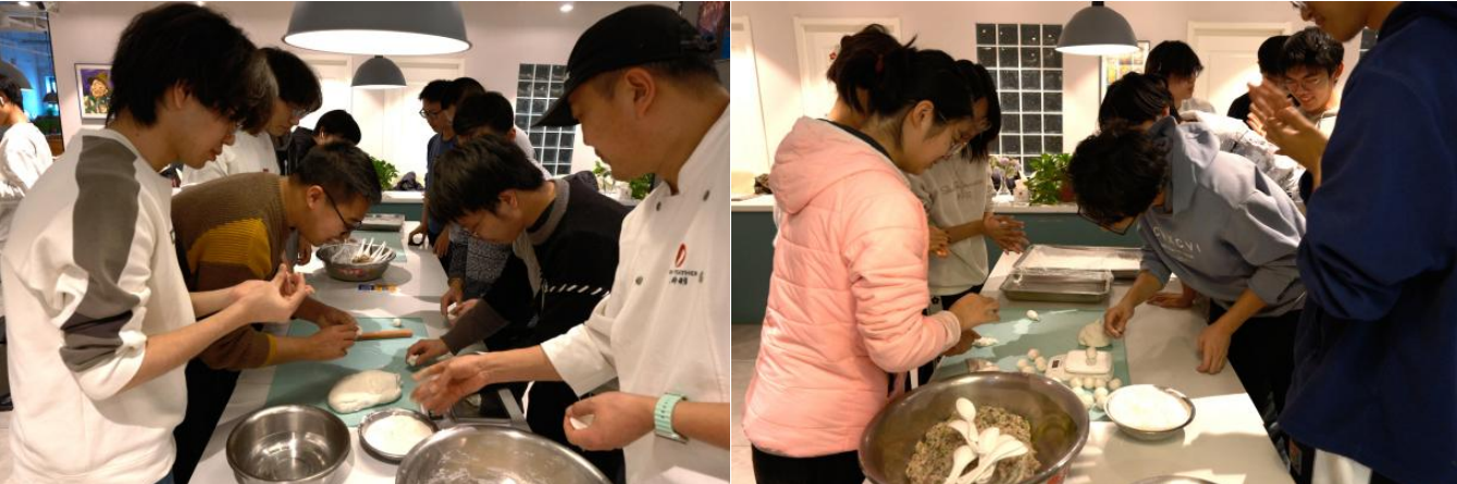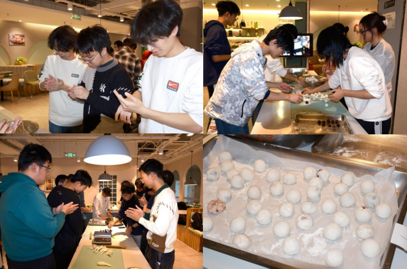 活动伊始,厨师率先开展包汤圆教学。从糯米粉加水的比例把控,到揉团的力度技巧,再到填馅、滚圆的精准操作,厨师师傅耐心示范,还针对同学们提出的“如何避免汤圆露馅”“糯米团粘手怎么办”等问题逐一解答,让平时专注科研学习的同学们快速掌握核心技能。