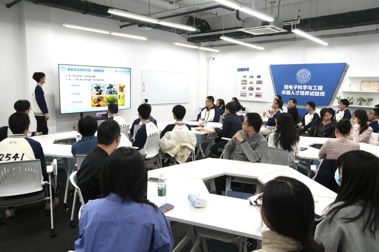 254112学生代表介绍微课题阶段性研究进展,分享了在科研探索与深度思考方面的体会。王墨远同学分享了“基础电路设计与仿真验证”课题组从仿真软件ADS中完成二级带通滤波器原理图到学习嘉立创EDA,初步绘制原理图和版图的过程。李新宇同学介绍“纳米磁畴的“高速公路”课题组成员利用磁控溅射薄膜生长Pt-Co-Pt材料的经历。刘芋胜同学介绍“桌面式光刻机开发”微课题开展情况,对未来实现全流程桌面式光刻机制造的目标表示期待。