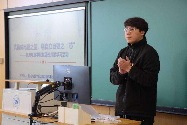 博士生第二党支部书记吴佳瑶作代表进行了深入学习习近平总书记关于创新人才的重要论述的主题分享交流,号召同学们夯实基础,聚焦国家重大战略需求,以突破技术瓶颈为己任,为实现技术自立自强,提升我国集成电路产业竞争力贡献智慧和力量。