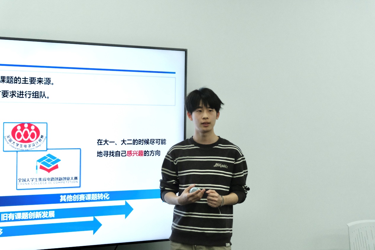 随后, 2024级硕士研究生陈依琴同学给同学们分享了她的成长经验。陈依琴曾任集成电路学院学生会主席,曾获小米奖学金、学业奖学金特等奖、创新创业奖学金一等奖等荣誉。她结合大学期间参与科创竞赛的经验,给学弟学妹们细致介绍了包括冯如杯在内的多项竞赛日程和准备工作。同时,陈依琴还就学生会工作分享了她的看法:参加学生会工作不仅可以服务他人,更是一个自我成长的过程,在学生工作中所锻炼的人际交往、沟通表达等综合能力将会使同学们受益终生。