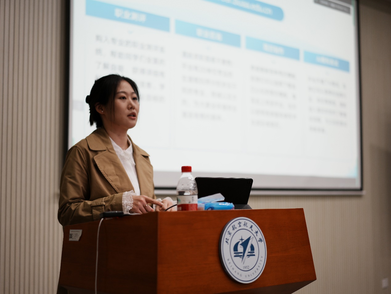 马雁老师首先给我们介绍了北航就业资讯网(career.buaa.edu.cn),并且说明了网站的丰富功能,包括职业测评、一对一咨询、个性化简历制作以及前沿的AI模拟面试等,鼓励每位同学充分利用这些资源,精准定位职业方向,优化求职材料,提前适应面试环境,从而在求职路上更加自信从容。