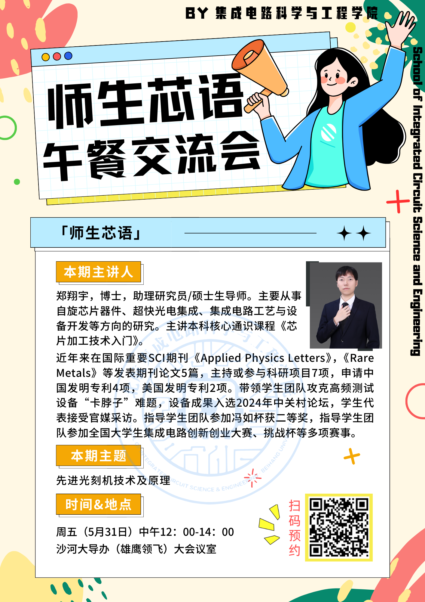 为增进与书院同学的沟通交流,帮助同学明晰专业选择方向,5月31日,集成电路学院在沙河校区大导办(雄鹰领飞)大会议室开展师生芯语午餐交流会。本次活动邀请了学院郑翔宇老师和大一信息类的同学们交流分享并答疑解惑。