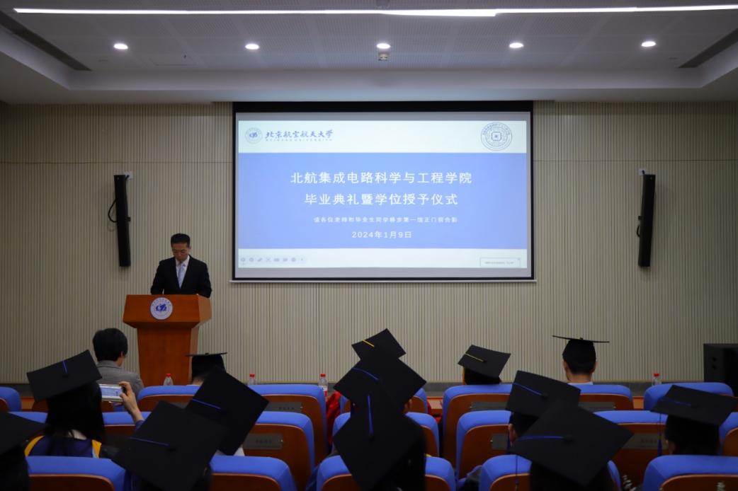 同行一路,终有一别。临别之际,他向毕业生提出三点嘱托:第一,要始终保持坚定的理想信念,把个人志向与国家的前途、民族的命运、人民的幸福结合在一起,时刻不忘我们是为国家做贡献的光荣北航集电人,真正实现北航人的价值;第二,要不断践行自我提升的自修之道,集成电路领域是充满挑战但又极具前景的领域,希望大家能够继续保持对知识的渴望和对创新的追求,发挥自己的激情和才能;第三,要保持对生活的热爱和对社会的责任感,保持良好的身体素质,健康的体魄能撑起美丽的梦想,在实现个人梦想的同时,也能为社会的进步和发展作出贡献,做一个健康快乐、高贵优雅、富有情怀的红色工程师。