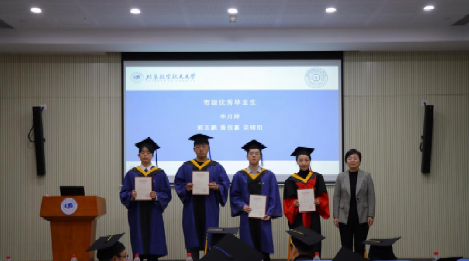 党委副书记马田宣读2024届优秀毕业生获奖名单,高静书记为北京市优秀毕业生颁发获奖证书,副院长胡远奇为校级一等优秀毕业生颁发获奖证书,集成电路工艺与装备系主任李奕晗、数理基础教研室主任雷娜为校级二等优秀毕业生颁发获奖证书。
