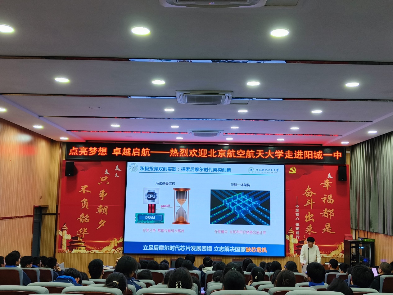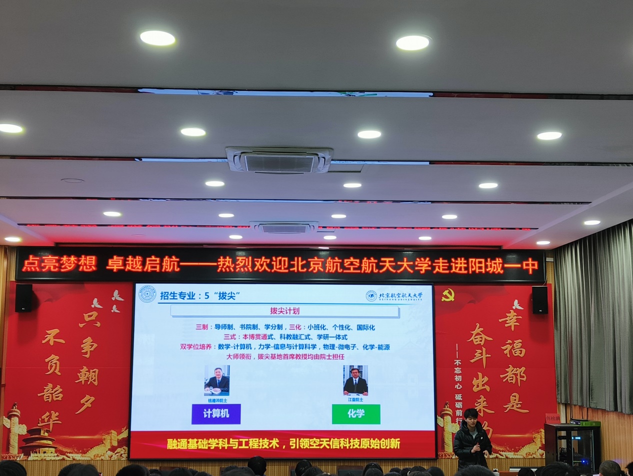 为弘扬北航空天报国精神,体现服务重大战略需求,北航山西招生组、北航集成电路学院“芯梦启航”实践队来到了阳城一中,围绕北航优势与北航集成电路学科建设进行了宣讲活动。