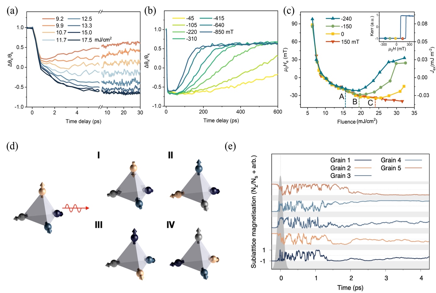为了解决这一难题,团队将CoGd亚铁磁合金引入反铁磁交换偏置体系,在IrMn/CoGd异质结中,首先研究了垂直交换偏置场在不同IrMn厚度和CoGd组分下的依赖性;其次,基于优化后的结构,实现了反铁磁交换偏置的单脉冲全光翻转,并深入探究了激光功率和脉冲数对交换偏置场的影响;接着,利用时间分辨磁光克尔测试技术,实现了时间尺度100 ps内的交换偏置翻转;最后,通过原子级仿真预测了反铁磁的亚皮秒超快动态,仿真结果表明在飞秒激光引起的超快退磁后,每个IrMn晶粒在2 ps内重新再磁化为单畴态,并且不同IrMn晶粒之间展现出独立且随机的概率性翻转。