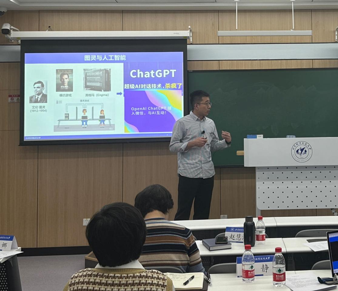 潘彪老师以“从卷积神经网络到ChatGPT”为主题,通过ChatGPT这一热门话题引出图灵测试及人工智能概念的起源,从生物神经元、人工神经元、单层感知机、多层感知机到全连接深度神经网络,全方位讲解人工智能技术的起源与发展历程。最后,潘老师从全连接的问题引出卷积神经网络的优势,引导学生对于人工智能爆发背后的科学发展一般规律的深入思考,从而生动细致地为学生绘制出面向未来的技术新图景。