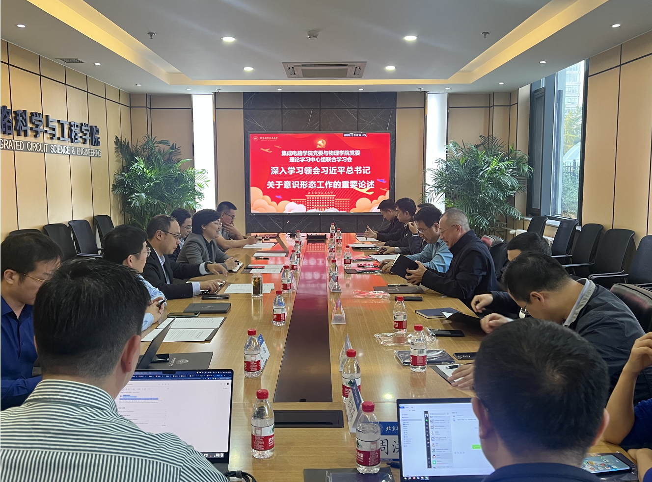 为全面贯彻习近平新时代中国特色社会主义思想和党的二十大精神,2023年10月31日下午,集成电路学院党委与物理学院党委开展理论学习中心组联学活动,深入学习领会习近平总书记关于意识形态工作的重要论述,研讨人才培养、推进理工交叉合作等重点工作。会议在第一馆113会议室举行,会议由集成电路学院党委书记高静主持,两院理论学习中心组成员、一线教师代表参加会议。