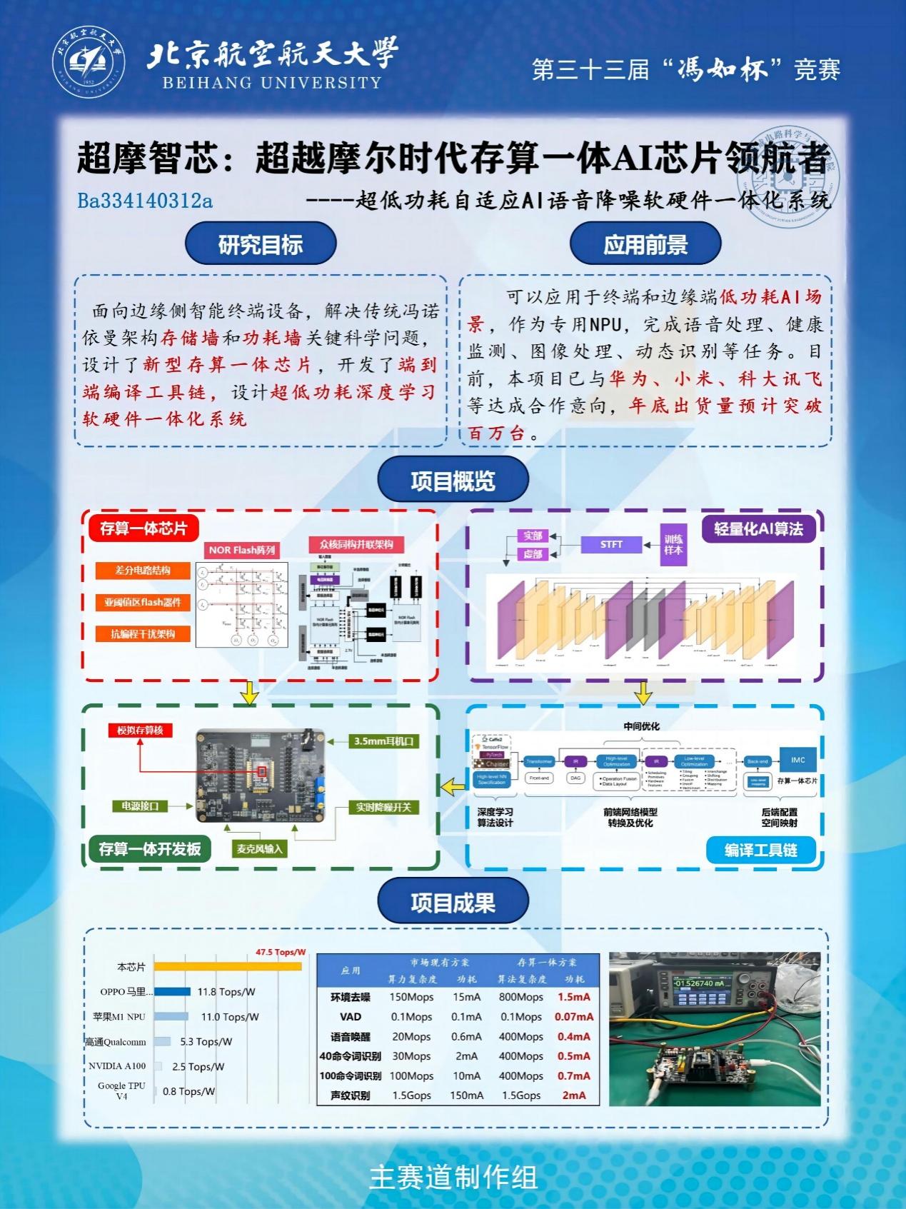 在全面贯彻党的二十大精神的开局之年,集成电路学院学子始终坚持聚焦国家重大战略需求,勇于创新,联系实际,努力实现创新向实践、基础研发向应用研发的跨越,在北航第三十三届“冯如杯”主赛道竞赛中共报名6个项目,均入围现场展示环节。经现场答辩,最终集成电路学院共斩获一等奖一名,二等奖三名,三等奖两名,其中,我院“超摩智芯——超越摩尔时代存算⼀体AI芯片领航者”项目,更是取得了本次冯如杯主赛道制作组一等奖最高分的好成绩!