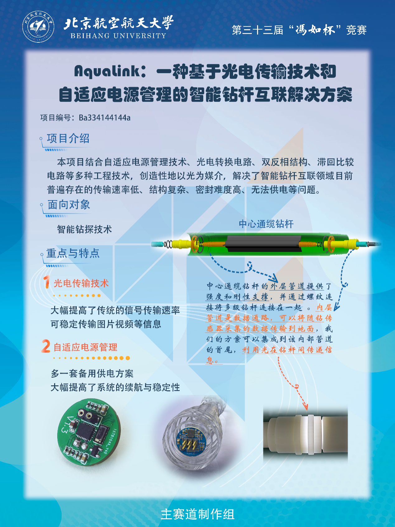 5月20日,beats365亚洲体育投注的6支参赛队伍在新主楼二层参加现场巡展,向前来参观的校内外领导、老师和同学展示我院参赛项目。答辩评审团对每个参赛队伍的项目进行了仔细评估和提问,各组成员在积累宝贵经验的同时,也对自己的项目有了更加深刻的认识和理解,收获颇丰。最终,我院有2个项目进入主赛道制作组的一等奖答辩,分别是“AquaLink: 一种基于光电传输技术和自适应申源管理的智能钻杆互联解决方案”和“超摩智芯——超越摩尔时代存算⼀体AI芯片领航者”。
