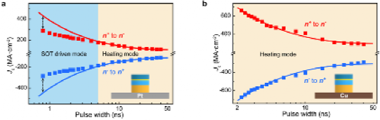 图2:Pt底电极(a)和Cu底电极(b)下,器件临界翻转电流密度Jc随脉冲宽度变化的关系。其中,Pt底电极器件在短于5纳秒脉冲宽度下出现偏移,表明SOT效应的存在。