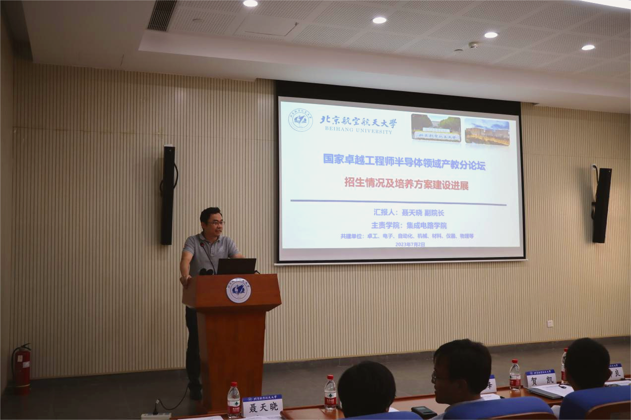 接着,聂天晓副院长进行汇报,分别对卓工专项背景、现有招生方案、现有招生情况和培养方案制定以及课程体系建设进行了详细介绍。半导体领域是构建信息社会发展与技术进步的基础与核心,但当前存在人才培养与产业严重脱节的问题,而卓越工程师为人才培养开拓了新的模式。北航作为卓越工程师首批改革试点单位,为解决校企脱节问题,推动企业与高校协同,共同制定卓越工程师的培养方案,培养半导体领域卓越工程师,为人才培养提供良好发展平台,助力我国芯片技术自立自强。