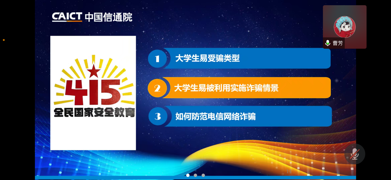 为贯彻总体国家安全观,增强学生的国家安全意识和素质,夯实以新安全格局保障新发展格局的社会基础,4月17日,集成电路学院开展了全民国家安全教育日网络和数据安全宣传教育活动。中国信息通信研究院安全研究所网络安全研究部副主任崔涛校友、政策法规研究员李晓伟、政策法规支撑专员曹芳结合国家安全教育面临的新形势新任务新要求,以在线讲座的形式为学生宣贯解读了《网络安全法》《数据安全法》《个人信息保护法》《反电信网络诈骗法》等相关法律规定,为学生积极维护国家安全打下了坚实基础。