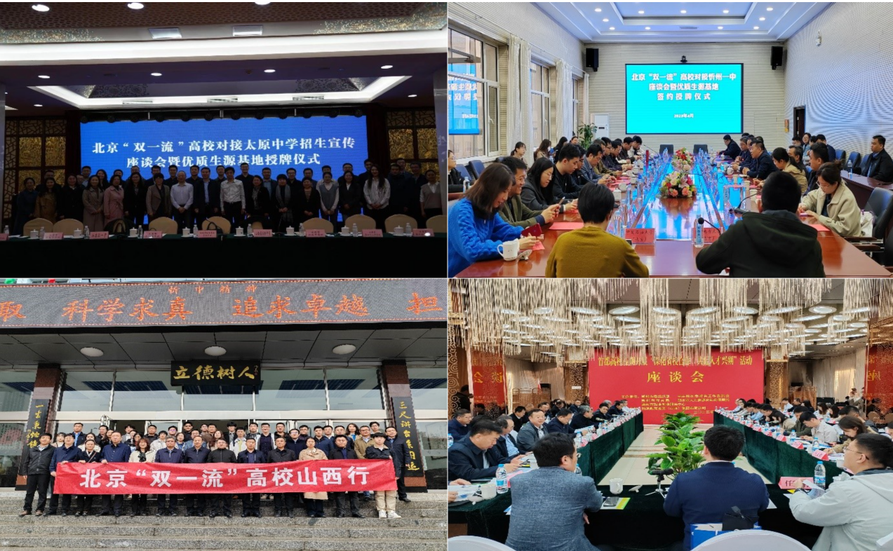 3月31日-4月4日,山西省人才办、教育厅联合举办山西与北京“双一流”高校合作交流活动,我校山西招生组应邀参加。集成电路学院党委副书记马田,辅导员刘亦文、谢魏然,生物学院教师贾潇凌一行4人先后前往大同、太原、忻州、朔州四市,参加2场咨询会和5场座谈会,走进忻州一中、怀仁一中等6所中学开展“教授进中学”等招生宣讲工作,与太原五中、山大附中等6所中学举行共建“优质生源基地”授牌仪式。