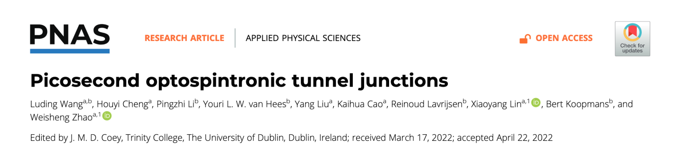 研究成果以“Picosecond Optospintronic Tunnel Junctions”为题,于6月7日在线发表于国际知名学术期刊《美国国家科学院院刊》(Proceedings of the National Academy of Sciences of the United States of America)。博士生王璐丁为论文第一作者,赵巍胜教授、林晓阳副教授为论文的通讯作者。