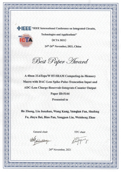 2021年11月24-26日,IEEEICTA(International Conference on Integrated Circuits, Technologies and Applications)在珠海召开。在本次会议上,北航集成电路学院存算一体芯片团队发表了题为“A 40nm 33.6Tops/W 8T-SRAM Computing-in-Memory Macro withDAC-less Spike-Pulse-TruncationInput and ADC-less Charge-Reservoir-Integrate-Counter Output”的研究成果,并荣获Best Paper Award奖项。我院博士后张和为该论文第一作者,beats365亚洲版官网为第一单位,康旺副教授为论文第一通讯作者。该工作获得了北京市科技新星项目和北京市自然科学基金的支持。