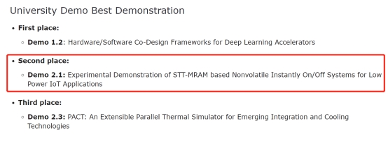 12月6日,DAC(国际设计自动化领域顶级会议,Design Automation Conference)举办第31届ACM/SIGDAUD(University Demonstration),该项比赛吸引国内外众多高校参加,最终十二所高校进入决赛。我院2020级工程博士李月婷作为第一作者,在康旺副教授和赵巍胜教授指导下获得亚军,题为“Experimental Demonstration of STT-MRAM based Nonvolatile Instantly On/Off Systems for Low Power IoT Applications”。该工作与首都师范大学邱柯妮副教授团队合作完成。此项成果通过软硬件协同设计方法实现基于STT-MRAM的低功耗非易失即时开闭系统,可适应不同形式的电源异常情况,为电池供电/自供能的低功耗物联网场景提供解决方案。