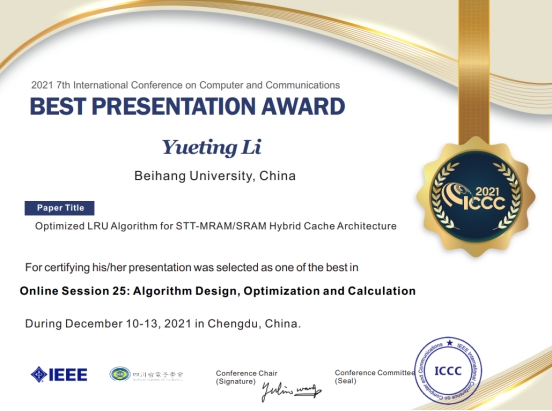 同时,在12月10-13日于成都举办的IEEE ICCC(International Conference on Computer and Communications)国际会议上,李月婷作为第一作者提出基于SRAM/STT-MRAM混合架构的缓存优化算法,题为“Optimized LRU Algorithm for STT-MRAM/SRAM Hybrid Cache Architecture”获得Best PresentationAward奖项,康旺副教授和赵巍胜教授为该论文通讯作者。
