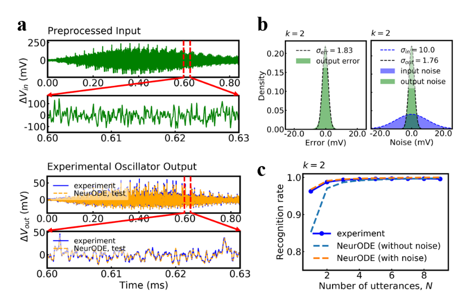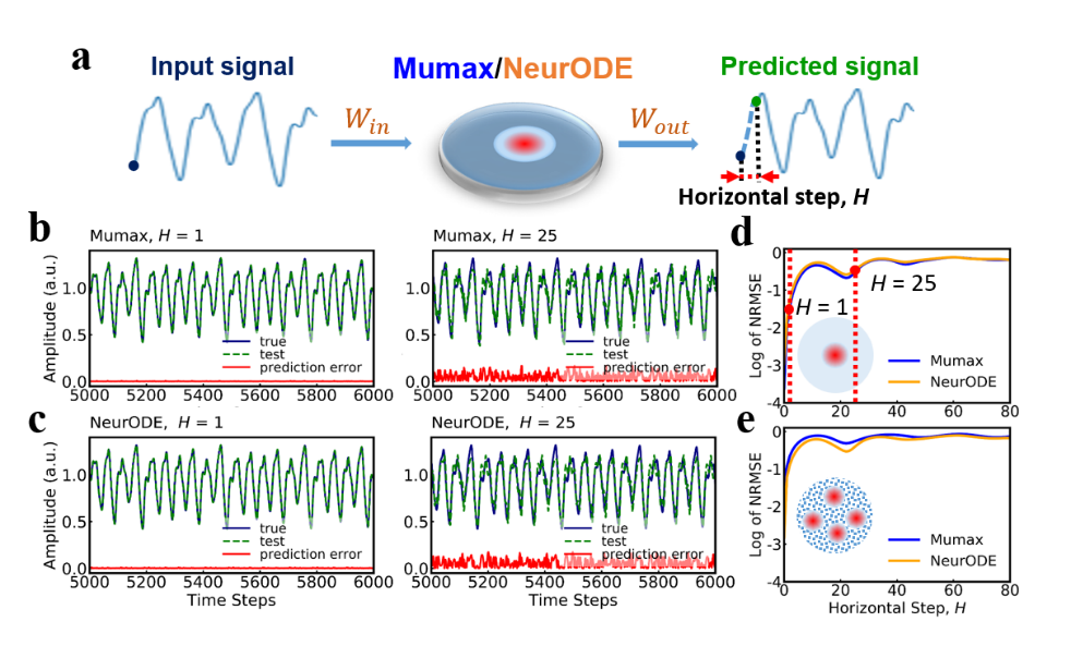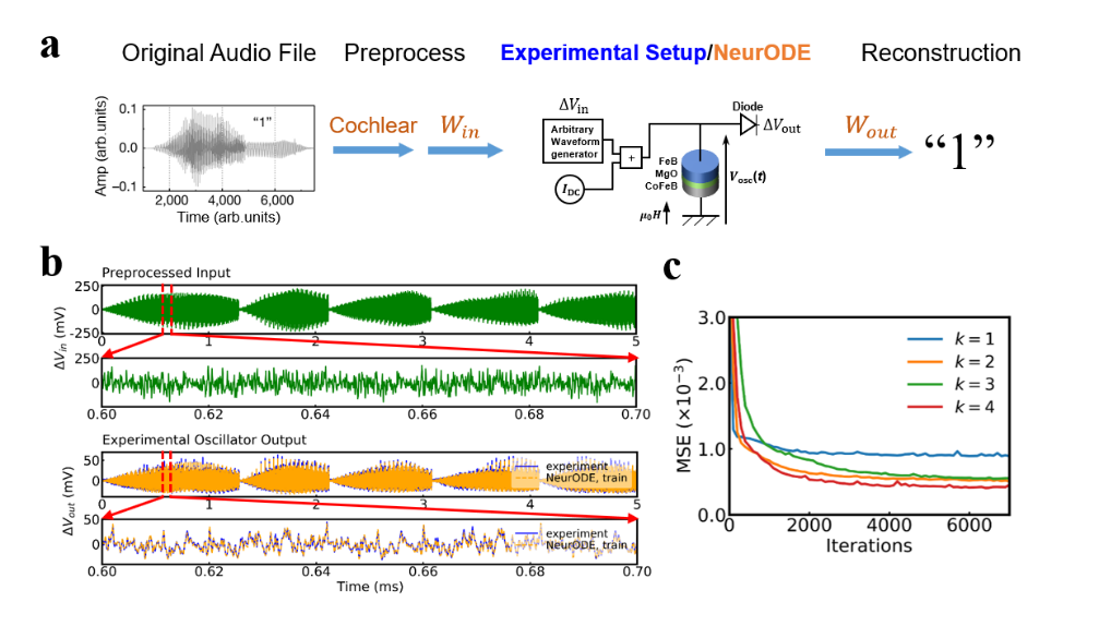 所提出模型在仿真和实验结果中均得到了验证。结果表明,该模型用于模拟一个基于斯格明子动力学的储备池计算系统,仅需不到20分钟,传统微磁学仿真工具则超过需要3天,极大提高了仿真效率。第二个实验中,对自旋电子纳米振荡器的五毫秒测量输入输出数据进行神经常微分方程训练后,可以预测其对带有噪声的输入信号的输出响应,并可以完整预测基于该自旋电子纳米振荡器的整个语音识别任务[1]。