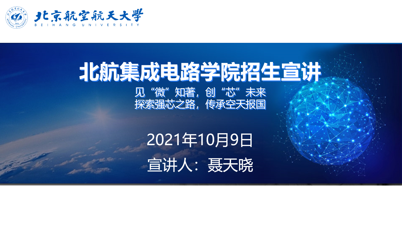 北航beats365亚洲体育投注(以下简称北航集成电路学院)2022级研究生招生线上宣讲会于2021年10月9日晚7点顺利举行。本次宣讲利用在线交流直播平台开展,受到了学生们的广泛关注。参与本次线上宣讲会的人员包括负责学院研究生教学培养的聂天晓副院长、温良恭老师、胡远奇老师、张慧老师、王鹏老师、许涌老师以及朱大鹏老师。