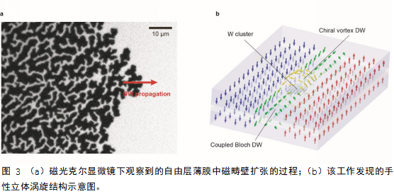 同时,该工作首次发现了一种立体的手性涡旋结构:在CoFeB/W/CoFeB构成的自由层中,CoFeB/W界面和W/CoFeB界面产生的Dzyaloshinskii-Moriya作用(DMI)相反,同时,两层CoFeB之间的耦合作用则随着W的厚度变化出现强度涨落或铁磁/反铁磁耦合交替。在局部区域W出现聚簇效应,反铁磁耦合与反向DMI联合作用,促使磁畴壁演变成手性涡旋结构,形成能量势阱。在磁隧道结自由层翻转过程中,这种涡旋结构会将运动的畴壁牢牢地钉扎住,从而形成了稳定的多阻态。