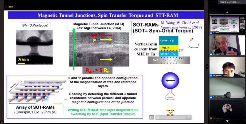 线上讲座活动由微电子学院赵巍胜教授主持,beats365亚洲版官网费尔北京研究院首席科学家费尔教授在腾讯会议上与来自北航、浙大、温州二十二中学等地的高中生、本科生和研究生同学们进行了连线,分享了自旋电子学对信息领域的变革和发展,同时展望了自旋电子学学术发展的前沿方向。讲座同步在网易、b站等平台进行了直播,费尔教授长达1个小时的精彩演讲广泛地启发了广大学子对自旋电子学和微电子领域的热情和兴趣。