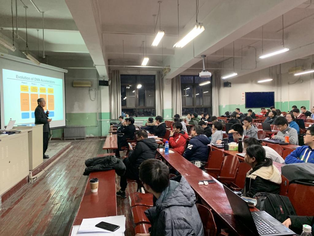 2019年12月16日我们十分有幸邀请到了深度学习芯片设计领域的著名专家Hoi-Jun Yoo教授来我校做题为 “Intelligence on Silicon: From DNN Accelerators to Super-Intelligence AI-SoCs” 的学术报告。我校微电子学院、计算机学院、电子信息工程学院近百名师生参加了本次报告。