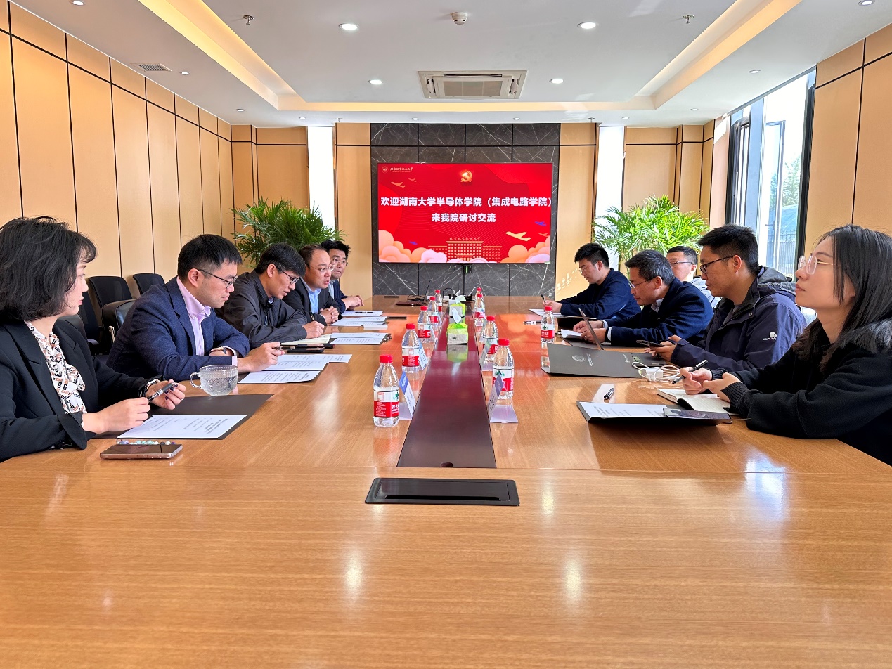 为学习贯彻党的二十大精神,落实学习贯彻习近平新时代中国特色社会主义思想主题教育“学思想、强党性、重实践、建新功”的总要求,4月26日上午,湖南大学半导体学院副院长张吉良、张明一行受邀来到我校集成电路学院开展调研交流。我校集成电路学院党委书记梁恩和、副院长张悦、胡远奇等参加了座谈。